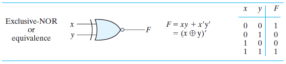 XNOR gate: XNOR gate is used for doing inverted the output of XOR gate and generates output accordingly. In bellow see the Graphic symbol, Algebraic function, Truth table Of XNOR gate. From the truth table you can see that the output is generated by inverted the output of XOR gate. The special ability of XNOR gate is it give logic 1 for same input of both inputs pin of XNOR gate.